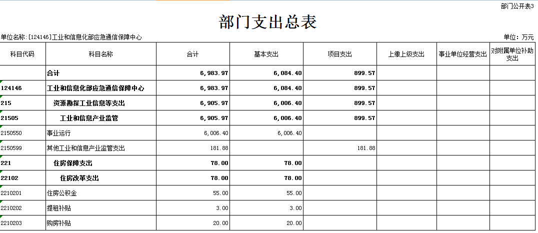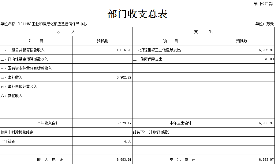 按照综合预算原则,工业和信息化部应急通信保障中心所有收入和支出均纳入部门预算管理。收入包括:一般公共预算拨款收入、事业收入、上年结转;支出包括:资源勘探工业信息等支出、住房保障支出。中心2022年收支总预算6983.97万元。