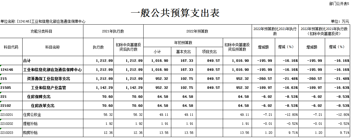 五、关于工业和信息化部应急通信保障中心2022年一般公共预算支出表的说明