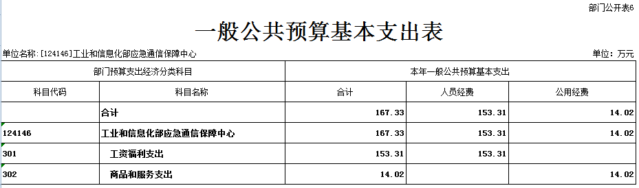 工业和信息化部应急通信保障中心2022年一般公共预算基本支出167.33万元。其中:人员经费153.31万元,主要包括:基本工资、津贴补贴、住房公积金。公用经费14.02万元,主要包括:办公费、印刷费、邮电费、差旅费、委托业务费、福利费、其他交通费用。