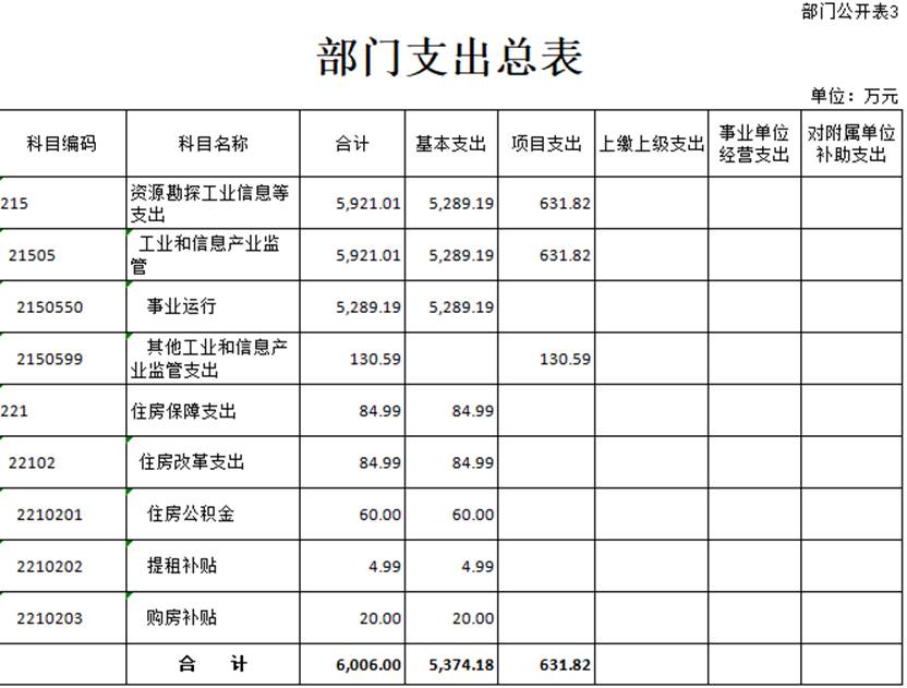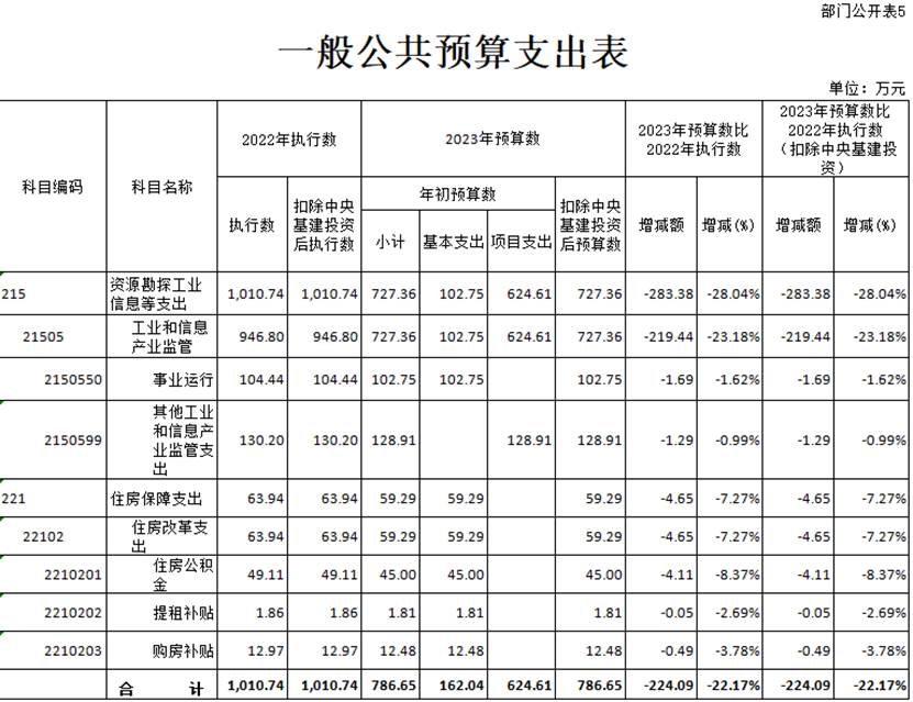 第三部分 工业和信息化部应急通信保障中心 2023年预算情况说明 一、关于工业和信息化部应急通信保障中心2023年收支总表的说明 按照综合预算的原则,工业和信息化部应急通信保障中心所有收入和支出均纳入部门预算管理。收入包括:一般公共预算拨款收入、事业收入、其他收入、上年结转;支出包括:资源勘探工业信息等支出、住房保障支出。中心2023年收支总预算6006.00万元。 二、关于工业和信息化部应急通信保障中心2023年收入总表的说明 工业和信息化部应急通信保障中心2023年收入预算6006.00万元,其中:上年结转7.85万元,占0.13%;一般公共预算拨款收入786.65万元,占比13.10%;事业收入5196.50万元,占比86.52%;其他收入15万元,占比0.25%。 三、关于工业和信息化部应急通信保障中心2023年支出总表的说明 工业和信息化部应急通信保障中心2023年支出预算6006.00万元,其中基本支出5374.18万元,占89.48%;项目支出631.82万元,占10.52%。 四、关于工业和信息化部应急通信保障中心2023年财政拨款收支总表的说明 工业和信息化部应急通信保障中心2023年财政拨款收支总预算794.50万元。收入包括:一般公共预算拨款786.65万元、上年结转7.85万元;支出包括:资源勘探工业和信息等支出734.57万元、住房保障支出59.93万元。 五、关于工业和信息化部应急通信保障中心2023年一般公共预算支出表的说明 工业和信息化部应急通信保障中心2023年一般公共预算支出786.65万元,比2022年执行数减少224.09万元,降低22.17%。按照党中央、国务院关于过紧日子的要求,厉行节约办一切事业,大力压减一般性支出,重点压减了非急需非刚性项目支出,同时合理保障了必要支出需求,体现在有关支出科目中。具体安排情况如下: (一)资源勘探工业信息等支出2023年预算为727.36万元,比2022年执行数减少283.38万元,降低28.04%。 (二)住房保障支出2023年预算数为59.29万元,比2022年执行数减少4.65万元,降低7.27%。 六、关于工业和信息化部应急通信保障中心2023年一般公共预算基本支出表的说明 工业和信息化部应急通信保障中心2023年一般公共预算基本支出162.04万元。其中: 人员经费148.02万元,主要包括:基本工资、津贴补贴、住房公积金。 公用经费14.02万元,主要包括:办公费、印刷费、邮电费、差旅费、委托业务费、福利费。 七、关于工业和信息化部应急通信保障中心2023年政府采购预算的说明 工业和信息化部应急通信保障中心2023年政府采购预算总额1301.74万元,其中:政府采购货物预算1189.74万元、政府采购服务预算112.00万元。 八、关于工业和信息化部应急通信保障中心2023年国有资产占用情况的说明 截至2022年8月31日,工业和信息化部应急通信保障中心共有车辆0辆;单位价值100万元及以上专用设备6台(套)。2023年部门预算安排更新购置车辆1辆;单位价值100万元及以上的专用设备0台(套)。 九、关于工业和信息化部应急通信保障中心2023年预算绩效管理情况的说明 2023年工业和信息化部应急通信保障中心对项目支出全面实施绩效目标管理,包括一般公共预算拨款项目2个,涉及资金624.61万元。根据以前年度绩效评价结果,优化项目支出2023年预算安排,并进一步改进管理。下一步,将按照财政部有关制度规定开展2023年绩效自评,加强评价结果应用。 第四部分 名词解释 一、收入科目 (一)财政拨款收入:指中央财政当年拨付的资金。 (二)事业收入:指事业单位开展专业业务活动及其辅助活动取得的收入。 (三)其他收入:指除上述“财政拨款收入”、“事业收入”、“事业单位经营收入”等以外的收入,如投资收益、利息收入等。 (四)上年结转:指以前年度尚未完成、结转到本年仍按原规定用途继续使用的资金。 二、支出科目 (一)社会保障和就业(类)行政事业单位养老(款):指用于行政事业单位养老方面的支出。 1.机关事业单位基本养老保险缴费支出(项):指工业和信息化部机关事业单位实施养老保险制度由单位缴纳的基本养老保险费支出。 2.机关事业单位职业年金缴费支出(项):指工业和信息化部机关事业单位实施养老保险制度由单位缴纳的职业年金支出。 (二)资源勘探工业信息等(类):反映用于资源勘探、制造业、建筑业、工业信息等方面支出,主要涉及工业和信息产业监管支出科目。 (三)住房保障支出(类)住房改革支出(款):指按照国家政策规定用于住房改革方面的支出。 1.住房公积金(项):是按照《住房公积金管理条例》的规定,由单位及其在职职工缴存的长期住房储金。该项政策始于上世纪九十年代中期,在全国机关、企事业单位在职职工中普遍实施,缴存比例最低不低于5%,最高不超过12%,缴存基数为职工本人上年工资。事业单位缴存基数包括国家统一规定的岗位工资、薪级工资、绩效工资、艰苦边远地区津贴、特殊岗位津贴等。 2.提租补贴(项):是经国务院批准,于2000年开始针对在京中央单位公有住房租金标准提高发放的补贴,中央在京单位按照在职在编职工人数和离退休人数以及相应职级的补贴标准确定,人均月补贴90元。 3.购房补贴(项):是根据《国务院院关于进一步深化城镇住房制度改革加快住房建设的通知》(国发〔1998〕23号)的规定,从1998年下半年停止实物分房后,房价收入比超过4倍以上地区对无房和住房未达标职工发放的住房货币化改革补贴资金。在京中央单位按照《中共中央办公厅 国务院办公厅转发