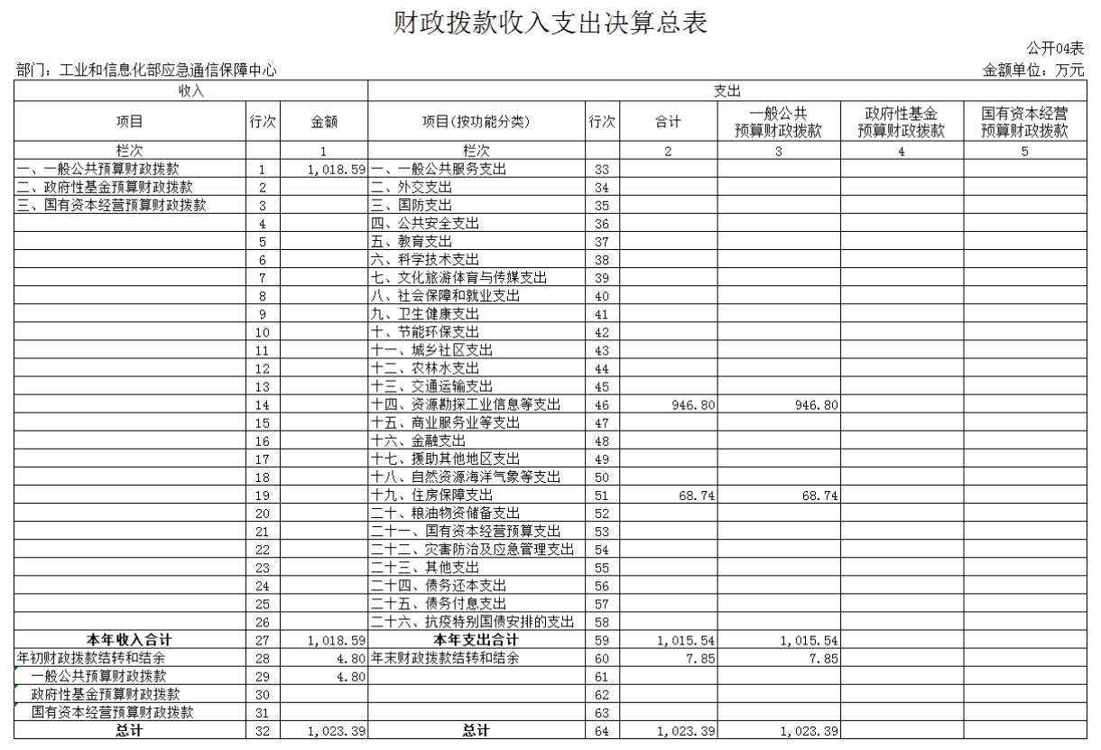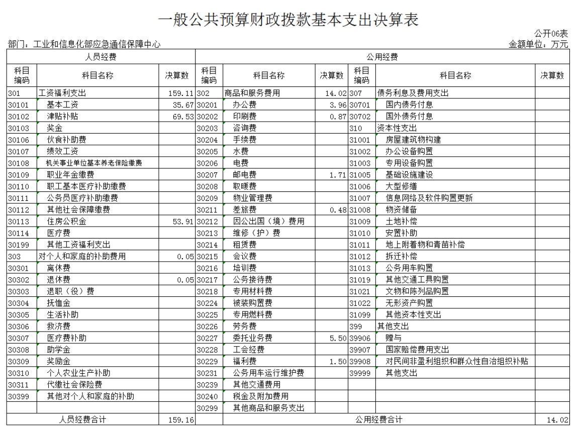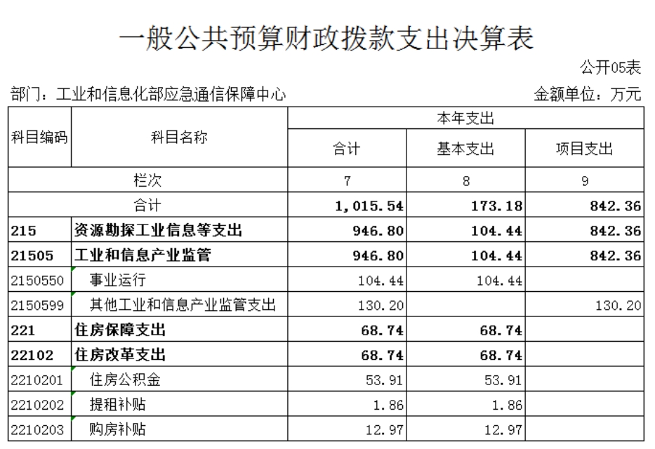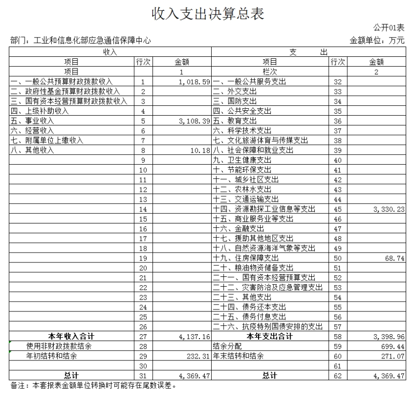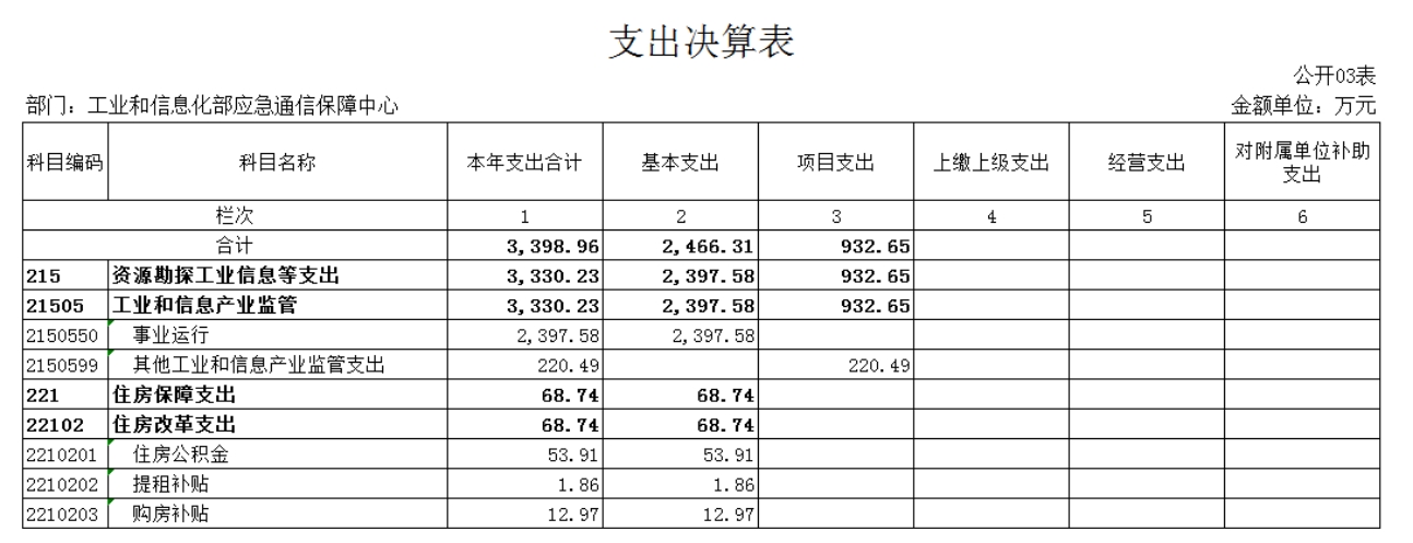 第一部分 工业和信息化部应急通信保障中心概况 一、基本情况 工业和信息化部应急通信保障中心成立于2013年,是经中央编办批复成立的工业和信息化部直属正局级事业单位。作为专业的应急通信支撑机构,秉承“平时服务、急时应急、战时应战”原则,承担应急值守、重大活动和突发事件通信保障等职责,提升应急通信保障能力,构建了部、省两级应急值守、视频会议和应急通信指挥调度系统运行维护体系,全力支撑工业和信息化部在突发事件、重大活动期间的通信保障工作。 二、工作职责 (一)负责工业和信息化部应急通信保障系统的运行维护等工作,承担应急通信日常值班任务。 (二)承担应急通信保障政策、规划、预案等研究工作。 (三)承担应急通信工程建设等具体工作。 (四)承担应急通信保障的技术支持、教育培训和合作交流等工作,为应急通信指挥决策提供技术和后勤保障。 (五)承担部管应急通信储备物资的管理维护工作。 (六)承担应急通信保障相关联络、协调和会商等工作。 (七)提供通信领域相关信息咨询、技术支撑、系统代理维护等服务。 (八)承办工业和信息化部交办的其他工作。 三、机构设置 本单位为工业和信息化部直属二级预算单位,单位性质为财政补助事业单位,决算编报类型为单户表,纳入本套决算编制范围的独立核算单位共1个。 第二部分 工业和信息化部应急通信保障中心 2022年部门决算表 第三部分 工业和信息化部应急通信保障中心 2022年决算情况说明 一、收入支出决算总体情况说明 2022年度收、支总计4,369.47万元,与2021年相比,收、支总计减少418.81万元,降低8.75%。主要原因是财政拨款收入较上年减少。 二、收入决算情况说明 2022年收入合计4,137.16万元。其中:财政拨款收入1,018.59万元,占24.62%;事业收入3,108.39 万元,占75.13%;其他收入10.18万元,占0.25%。 三、支出决算情况说明 2022年支出合计3,398.96万元。其中:基本支出2,466.31万元,占72.56%;项目支出932.65万元,占27.44%。 四、财政拨款收入支出决算总体情况说明 2022年度财政拨款收、支总计1,023.39万元。与2021年相比,财政拨款收、支总计减少256.43万元,降低20.04%。主要原因是财政项目拨款减少,相应支出减少。 五、一般公共预算财政拨款支出决算情况说明 2022年度一般公共预算财政拨款支出1,015.54万元,占本年支出合计的29.88%。其中基本支出173.18万元,项目支出842.36万元。 六、一般公共预算财政拨款基本支出情况说明 2022年一般公共预算基本支出173.18万元。其中:人员经费159.16万元,主要包括:基本工资、津贴补贴、住房公积金、退休费。公用经费14.02万元,主要包括:办公费、印刷费、邮电费、差旅费、委托业务费、福利费。 七、一般公共预算财政拨款“三公”经费支出决算情况说明 2022年度“三公”经费财政拨款支出预算为0万元,支出决算为0万元。 八、其他重要事项的情况说明 (一)政府采购支出情况。 2022年度,政府采购支出总额415.03万元。其中:政府采购货物支出45.32万元、政府采购工程支出0万元、政府采购服务支出369.71万元。授予中小企业合同金额415.03万元,占政府采购支出总额的100.00%。其中:授予小微企业合同金额210.56万元,占政府采购支出总额的50.73%。 (二)国有资产占用情况。 截止2022年12月31日,本单位共有车辆0辆;单位价值100万元及以上专用设备6台(套)。 第四部分 名词解释 一、收入科目 (一)财政拨款收入:指中央财政当年拨付的资金。 (二)事业收入:指事业单位开展专业业务活动及其辅助活动取得的收入。 (三)其他收入:指除上述“财政拨款收入”、“事业收入”、“经营收入”等以外的收入,如投资收益、利息收入等。 (四)年初结转和结余:指单位本年度或以前年度预算安排、因客观条件发生变化未全部执行或未执行,结转到以后年度继续使用的资金,或项目已完成等产生的结余资金。 二、支出科目 (一)社会保障和就业(类)行政事业单位养老(款):指用于行政事业单位养老方面的支出。 1.机关事业单位基本养老保险缴费支出(项):指工业和信息化部机关事业单位实施养老保险制度由单位缴纳的基本养老保险费支出。 2.机关事业单位职业年金缴费支出(项):指工业和信息化部机关事业单位实施养老保险制度由单位缴纳的职业年金支出。 (二)资源勘探工业信息等(类):反映用于资源勘探、制造业、建筑业、工业信息等方面支出,主要涉及工业和信息产业监管支出科目。 (三)住房保障支出(类)住房改革支出(款):指按照国家政策规定用于住房改革方面的支出。 1.住房公积金(项):是按照《住房公积金管理条例》的规定,由单位及其在职职工缴存的长期住房储金。该项政策始于上世纪九十年代中期,在全国机关、企事业单位在职职工中普遍实施,缴存比例最低不低于5%,最高不超过12%,缴存基数为职工本人上年工资。事业单位缴存基数包括国家统一规定的岗位工资、薪级工资、绩效工资、艰苦边远地区津贴、特殊岗位津贴等。 2.提租补贴(项):是经国务院批准,于2000年开始针对在京中央单位公有住房租金标准提高发放的补贴,中央在京单位按照在职在编职工人数和离退休人数以及相应职级的补贴标准确定,人均月补贴90元。 3.购房补贴(项):是根据《国务院院关于进一步深化城镇住房制度改革加快住房建设的通知》(国发〔1998〕23号)的规定,从1998年下半年停止实物分