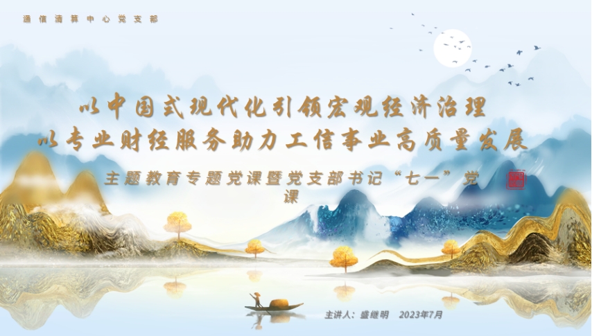 为深入学习贯彻习近平新时代中国特色社会主义思想,推进国家治理体系和治理能力现代化,扎实开展财政资金监管、财经政策研究、财务管理服务,围绕专业特色扎实干事创业行动。7月28日,通信清算中心(以下简称清算中心)党支部书记盛继明讲授“以中国式现代化引领宏观经济治理、以专业财经服务助力工信事业高质量发展”专题党课。