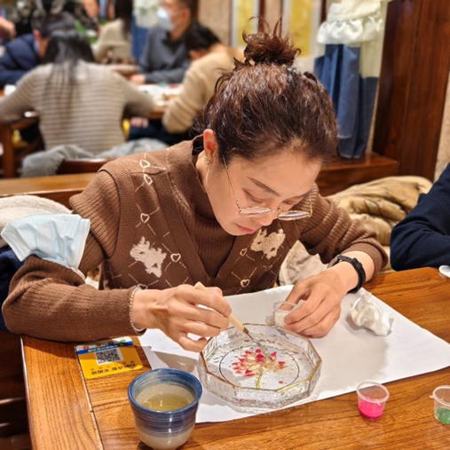 活动现场,工会主席王慧静同志代表单位对全体女职工表达了深切关怀和慰问,向大家致以节日问候和美好祝福,并表示,掐丝珐琅是我国非物质文化遗产之一,也是中华优秀传统文化的重要组成部分,是中华民族智慧与文明的结晶。新时代新征程上,我们要凝聚青春力量,弘扬传统文化,让“国潮”“手绘”等元素融入文化遗产,充分感受非遗之美,用“指尖上的艺术”让非遗文化“鲜活”起来!活动中,主讲老师为大家讲解掐丝珐琅的历史渊源、发展历程和掐丝工艺流程。女职工们跃跃欲试,在老师讲解完毕后迅速开始了掐丝珐琅的制作,大家小心翼翼地拿起金丝,全神贯注地按照底板轮廓勾勒出一个个生动的线条,经过注胶、掐丝、调沙、点蓝等工序后,一幅幅精美的作品在女职工们的巧手下呈现出来,大家脸上都洋溢着幸福、满足的笑容。